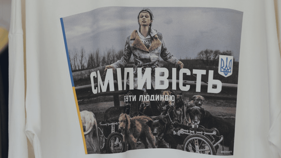 Для принтов широко использовали самые разные фото. Особенно известной стала футболка на которой фотография волонтерши, которая вывозила из Ирпеня собак с инвалидностью. Автор этого фото американец Кристофер Окиоке.