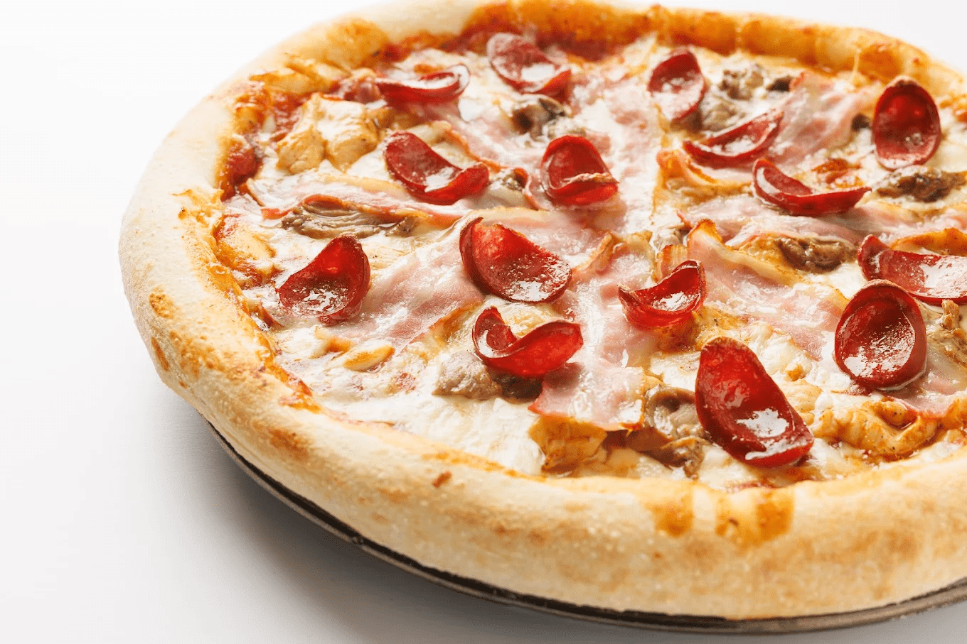 - Класичні м’ясні варіанти: такі як ароматна «Пепероні» з пікантною ковбаскою, соковита «Салямі» або ситна піца з шинкою та грибами.
